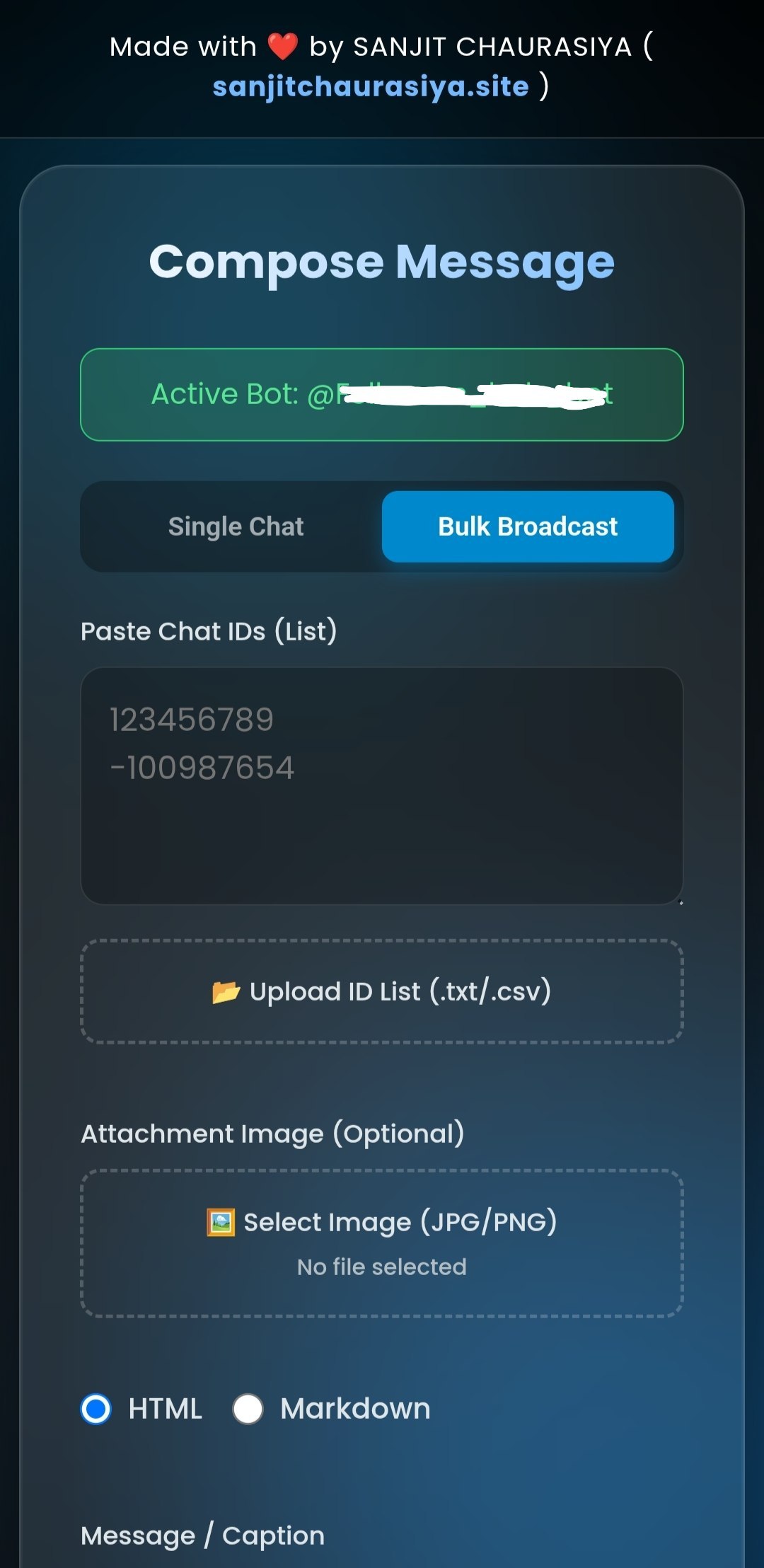 ✅ Zero Setup: Runs on standard PHP (No Database Required) ✅ Smart Bot Auth: Secure login via Bot Token ✅ Rich Media: Send Text or Images with Captions ✅ Dual Sending: Direct DM & Bulk Broadcasting ✅ Bulk Importer: Auto-extracts Chat IDs from .txt / .csv ✅ Pro Formatting: Supports HTML & Markdown styles ✅ Live Logs: Real-time success/failure status ✅ 3D Premium UI: Glassmorphism design ✅ Fully Responsive: Mobile & Desktop ready