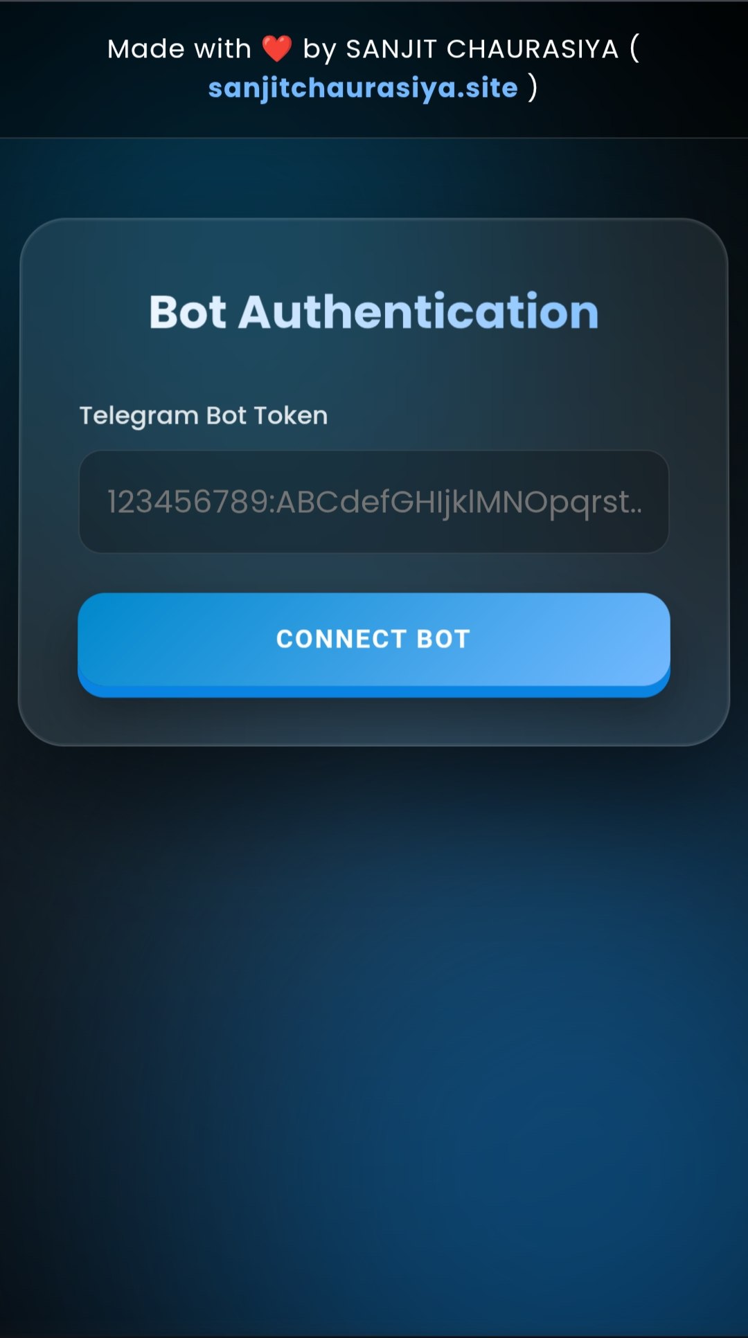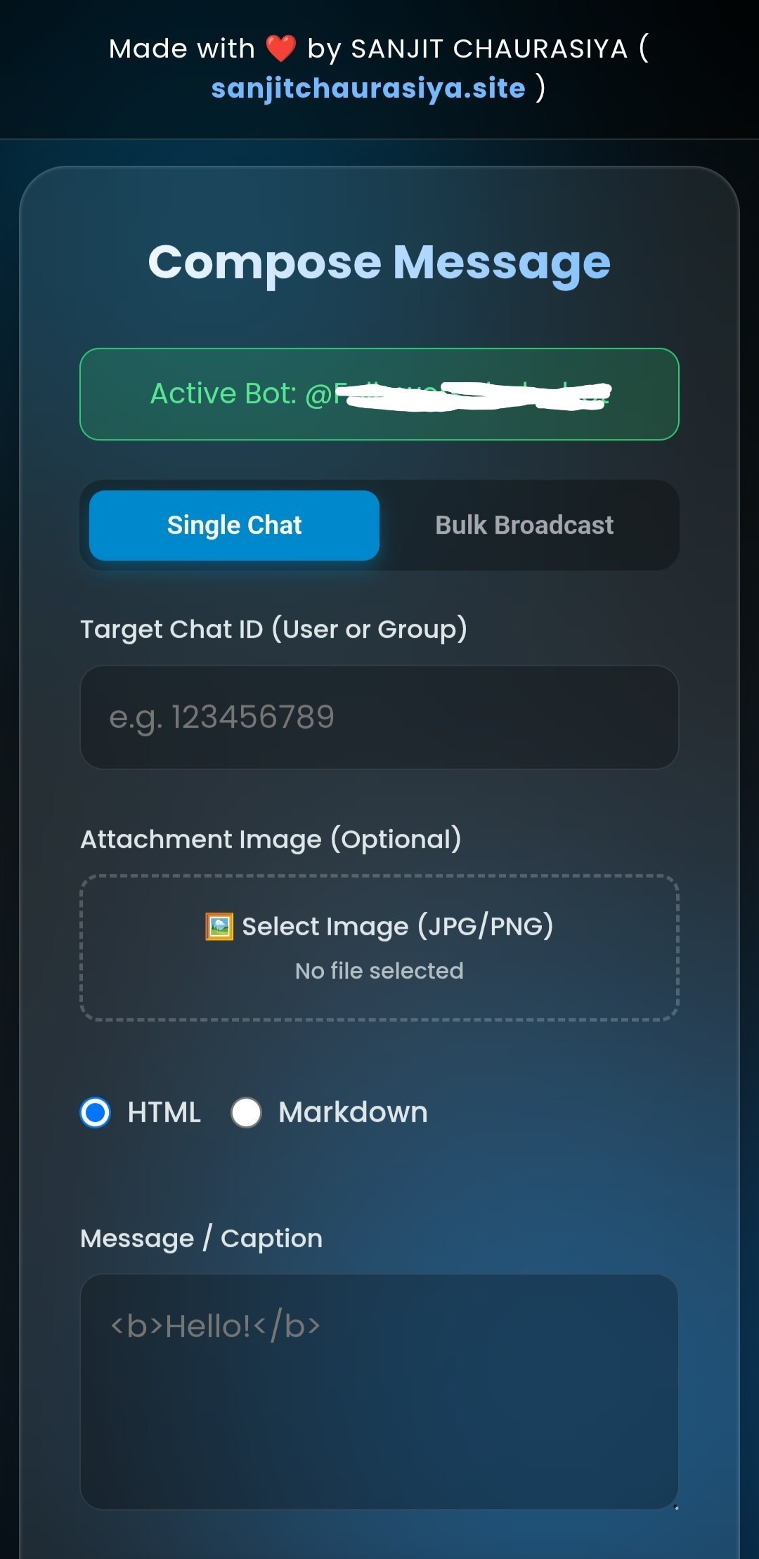 ✅ Zero Setup: Runs on standard PHP (No Database Required) ✅ Smart Bot Auth: Secure login via Bot Token ✅ Rich Media: Send Text or Images with Captions ✅ Dual Sending: Direct DM & Bulk Broadcasting ✅ Bulk Importer: Auto-extracts Chat IDs from .txt / .csv ✅ Pro Formatting: Supports HTML & Markdown styles ✅ Live Logs: Real-time success/failure status ✅ 3D Premium UI: Glassmorphism design ✅ Fully Responsive: Mobile & Desktop ready